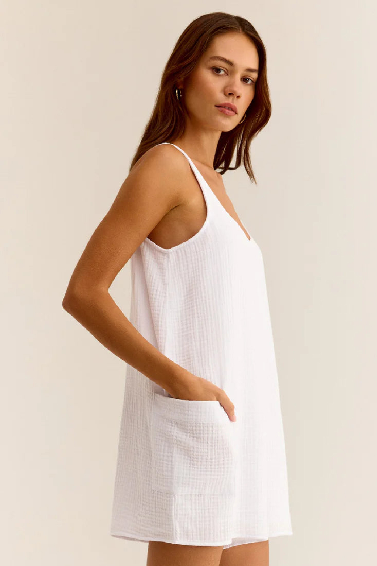Hafif ve nefes alan kumaşı ile sıcak yaz günlerinde serinlik sağlayan cepli plaj elbisesi, plajda bikini veya mayo üzerine rahatlıkla giyilebileceği gibi, günlük hayatta da sandalet veya spor ayakkabı ile kombinlenerek modern bir tarz oluşturur. Mini boyu sayesinde genç ve dinamik bir görünüm sunarken, beyaz rengin sadeliği ile farklı aksesuarlarla kolayca uyum sağlar.