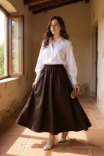 - Özel Gün Kombini: Ipek gömlek, inci detaylı şal ve topuklu ayakkabılarla kahverengi eteği davetlerde zarif bir şekilde kullanabilirsiniz.