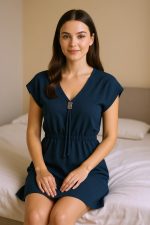 - Kadın Lacivert Yanları Yırtmaçlı Tokalı V Yaka Mini Plaj Elbisesi, yazın zarifliğini ve konforunu bir arada sunuyor.