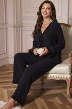 - Ev giyiminde hem şıklığı hem de rahatlığı bir arada arayan kadınlar için tasarlanan Kadın Siyah Önden Bağlamalı Kolu ve Paçası Fırfır Detaylı Uzun Kollu Pijama Takımı, asil duruşu ve modern tasarımıyla ön plana çıkıyor.